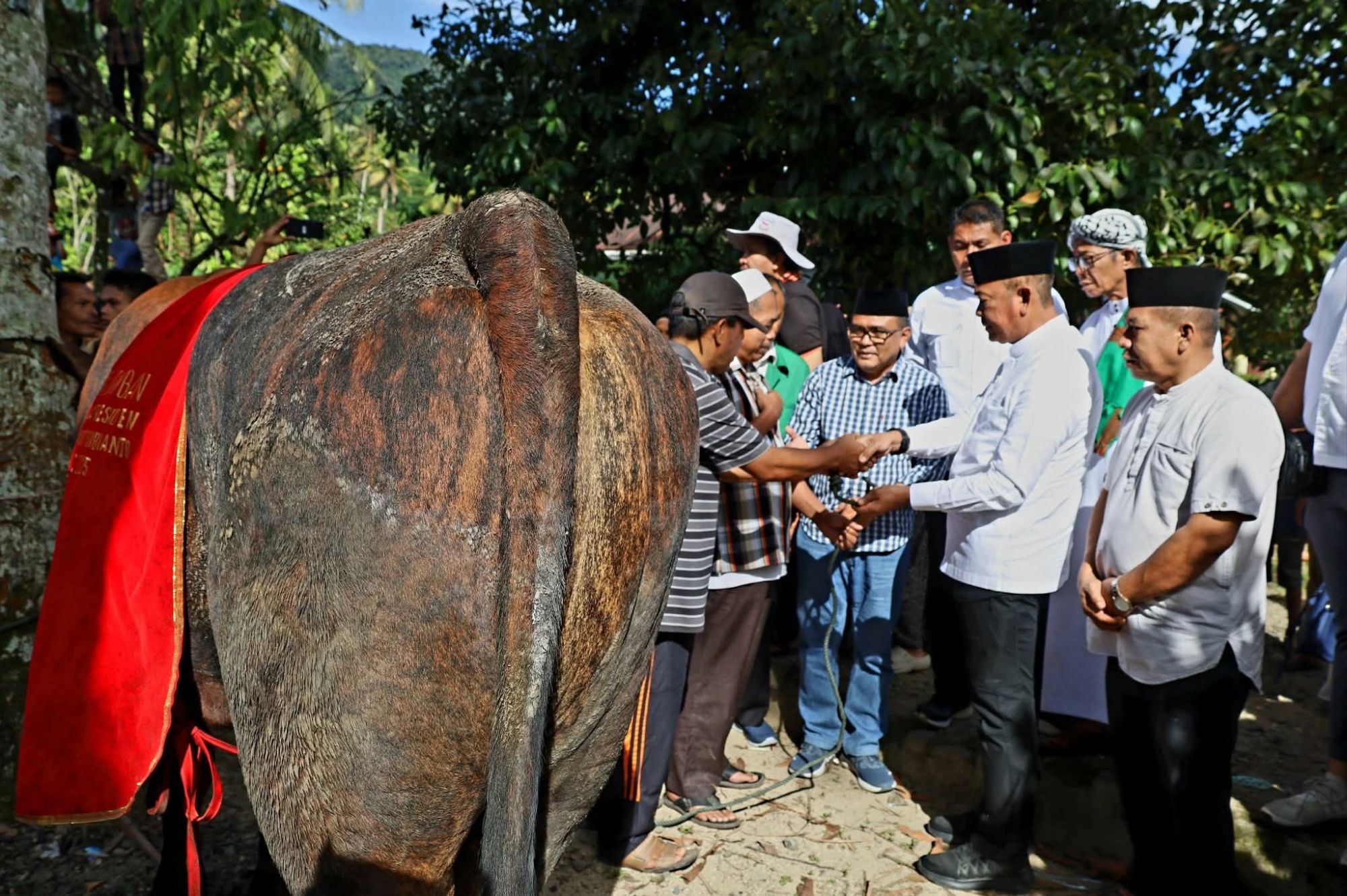 Sapi jenis Simental itu diserahkan kepada panitia kurban kelurahan tersebut dengan disaksikan oleh tokoh agama, tokoh masyarakat, dan warga yang hadir. Tak hanya itu, Bupati Saipullah juga menyerahkan satu ekor kurban atas nama keluarga.