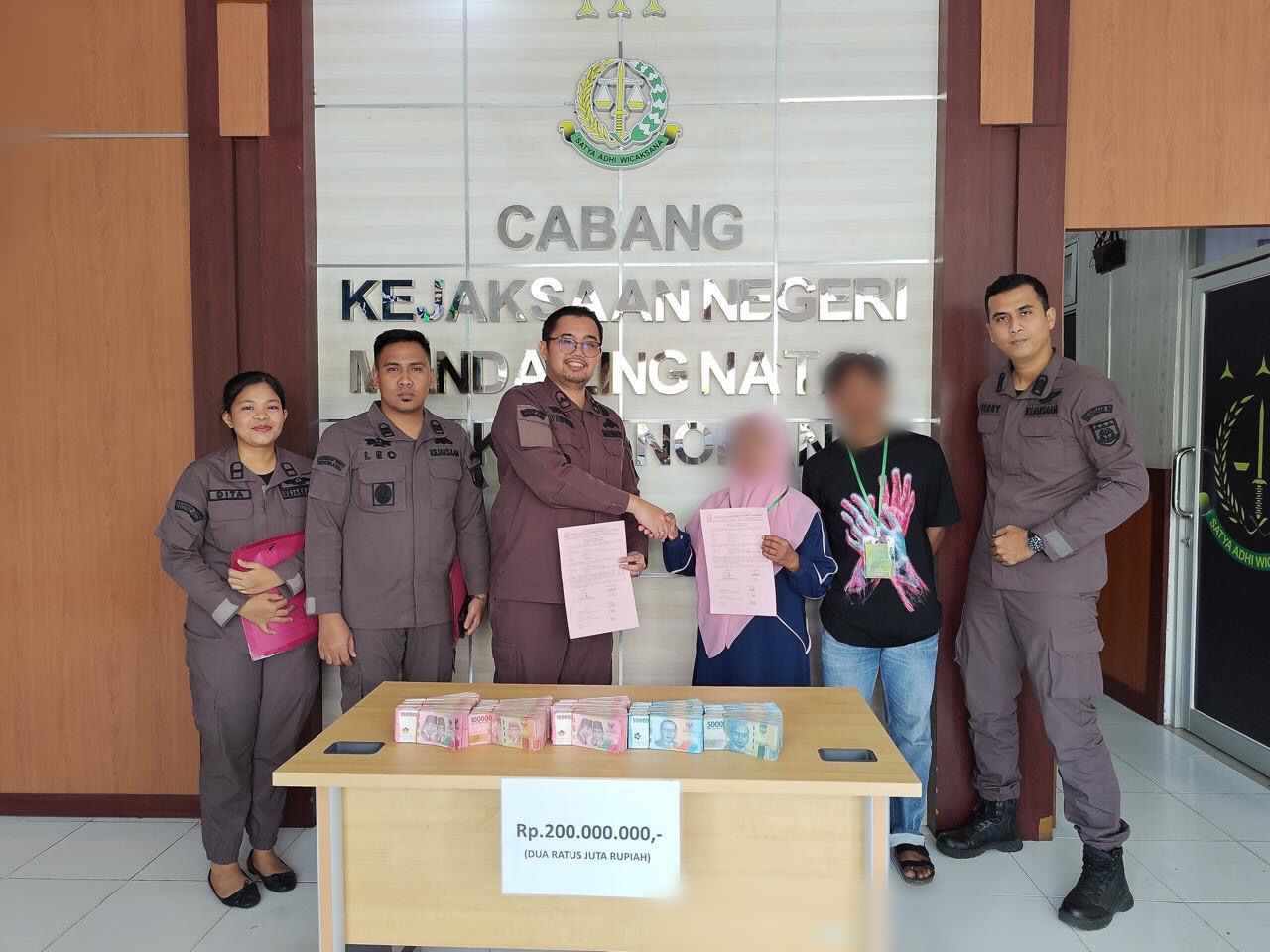 Setelah diterima, uang tersebut kemudian diserahkan oleh Penuntut Umum kepada Bendahara Penerima dengan disaksikan oleh Kaur Pembinaan. Selanjutnya, uang tersebut langsung disetorkan ke Rekening RPL CKN Mandailing Natal di Kotanopan.