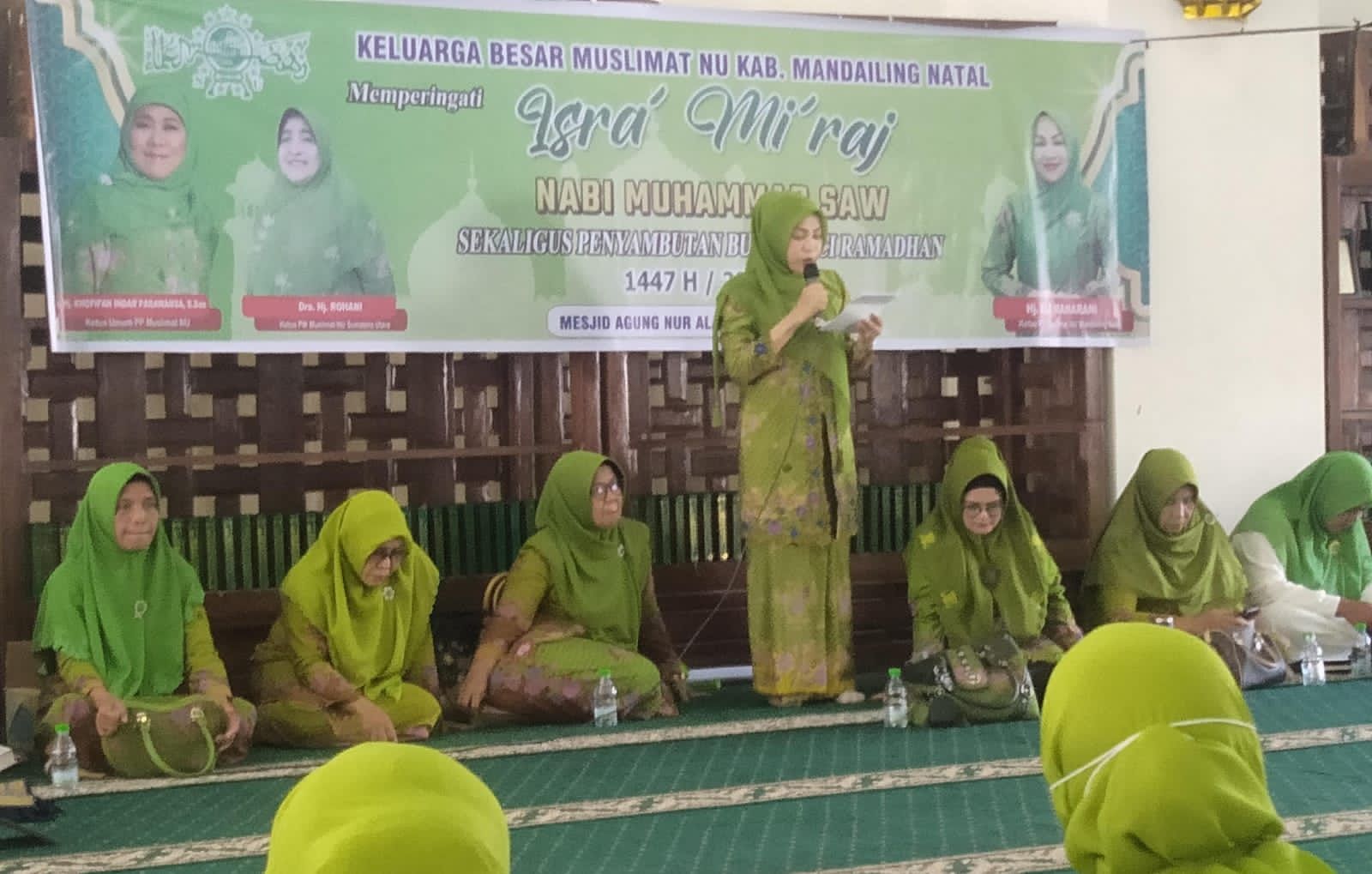 MNC Trijaya Mandailing Natal (25/01) (Panyabungan) – Muslimat Nahdlatul Ulama (NU) Kabupaten Mandailing Natal menggelar peringatan Isra Mi’raj Nabi Muhammad SAW sekaligus penyambutan bulan suci Ramadhan, yang dirangkaikan dengan penyerahan bantuan, bertempat di Masjid Agung Nur Ala Nur, Minggu (25/1/2026).