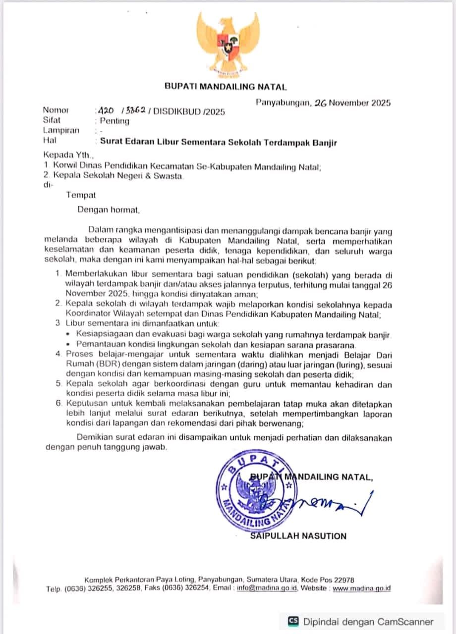 Dalam surat edaran yang diterima redaksi Rabu, (26/11) Bupati Madina, Saipullah Nasution menyampaikan 6 Poin Dalam rangka mengantisipasi dan menanggulangi danpak bencana banjir yang melanda beberapa wilayah di Kabupaten Mandailing Natal, serta memperhatikan keselamatan dan keamanan peserta didik, tenaga kependidikan, dan seluruh warga