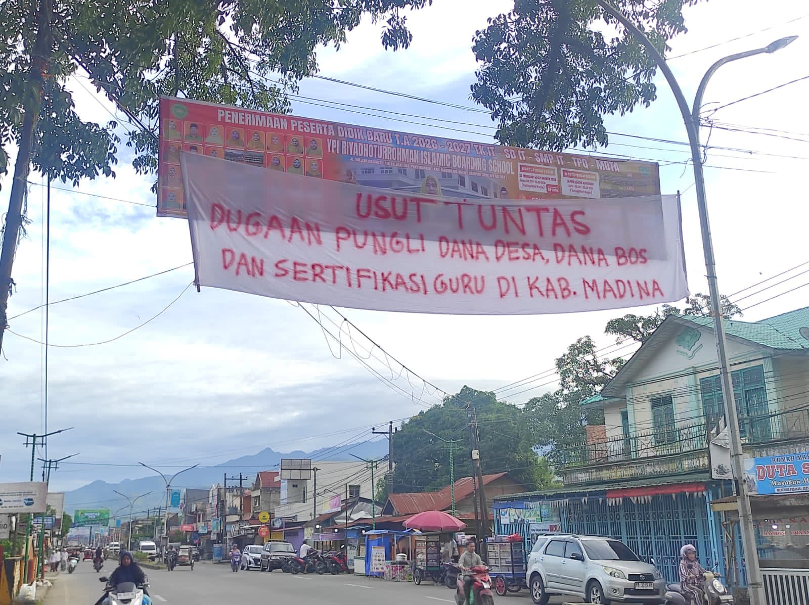 Dalam spanduk ditulus dikain putih berisi ” Bupati gagal sejahtrakan masyarakat madina, dugaan banyaknya pungli, Saipullan Nasution harus mundur dari jabatannya” namun tidak ada yang bertanggung jawab dalam tulisan spanduk. Alias tak bertuan.