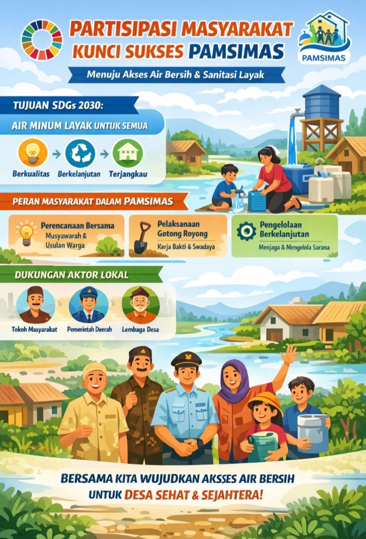 Jika langkah-langkah ini dijalankan secara konsisten, PAMSIMAS tidak hanya akan menghasilkan sarana air minum dan sanitasi yang berfungsi, tetapi juga melahirkan masyarakat yang lebih berdaya, lebih peduli, dan lebih siap mempertahankan kualitas hidupnya. Kini saatnya semua pihak—pemerintah daerah, desa, dan masyarakat—menyadari bahwa keberhasilan program ini sepenuhnya ditentukan oleh kemauan untuk terlibat. Tanpa partisipasi, PAMSIMAS hanya menjadi proyek; tetapi dengan partisipasi, PAMSIMAS berubah menjadi gerakan bersama untuk masa depan yang lebih sehat dan berkelanjutan.(Kel)